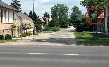 Út melletti kerékpárút jelzőtábla. Azaz létezik egy olyan jelzőtábla, amit akkor helyeznek el, amikor a kerékpárút önálló útként az út mellett fut. Ilyen jelzés ezen a településen nincs, tehát ez is azt bizonyítja, hogy a kerékpárút ezen a helyen az út részeként került kialakításra.
