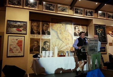 A beérkezés utáni díjkiosztóra egy nagyon stílusos teremben került sor, a falon a fontos műszaki úttörők között Vincenzo Lancia képe is megtalálható volt, középen a Mille Miglia egykori térképével, de a terem többi része is a motorsport relikviáival volt tele.