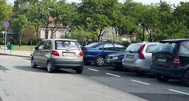 A képen egy merőlegesen kialakított várakozóhelyet láthatunk, a személygépkocsi az itt parkoló autók előtt tartózkodik.