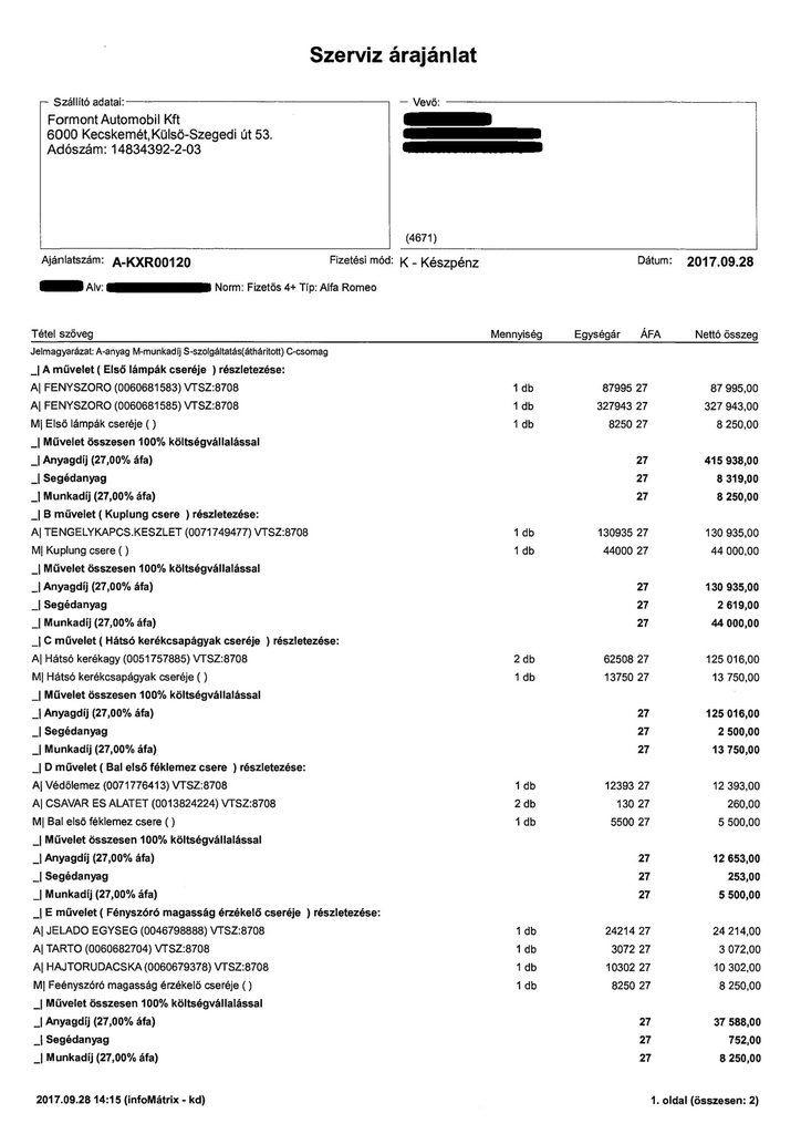Én is ezt tettem volna a helyében, csakhogy ő látta a jogilag bombabiztos jegyzőkönyvet, amikor megvette az Alfát. Így most ügyvédjével perre készül a kereskedéssel szemben. Szilvia levelét érdemleges tartalmi változtatás nélkül olvashatják, benne kinagyítható a Formont Automobil Kft. hivatatalos Alfa Romeo és Fiat márkakereskedés és szerviz árajánlata és hibalistája. Ezt akkor készítették, amikor nyilvánvalóvá vált, hogy nagy baj van az autóval, és azért, mert Szilvia szeretett volna megbízható forrásból tájékozódni az autó műszaki állapotáról.