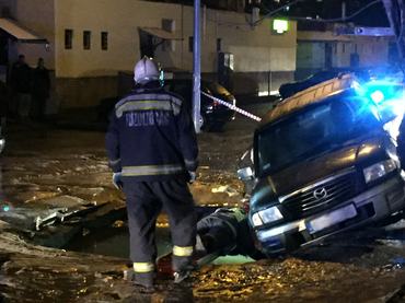 A lyukba belógó sofőr sértetlenül kiszállt, a katasztrófavédelem pedig kiemelte az autót.