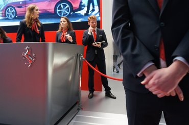 Szóval elhatároztam, hogy körbejárom a ma kapható leggyorsabb 488-ast, vagyis a kicsi, középmotoros, nagyjából a 911-es Porsche magasságában játszó Ferrari végső, csúcsverzióját. 12:50-kor álltam be a bejárathoz, ahol egy velem egykorú srác, méretre szabott öltönyben akasztgatta a bársony kordont, jelezte, hogy pár percet sorba kéne állnom, hiába van sajtóbelépőm. Bevett gyakorlat ez, hiszen ha túlzsúfolt a stand, ott nem lehet dolgozni, viseltem hát, amit rám rótt az élet.