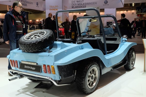 Eleve nem fér össze a fejemben a Škoda-logó alatt elterülő stand, egy fura Land Rover-szerűség, illetve egy babakék, hamisítatlan, amerikai dune buggy képe. Hatvanas-hetvenes évek fordulója és a Škoda név? Nekem bizony bénává faceliftelt, harmadik szériás 1000MB-k és lúdtalpas, nejlonzokni-szagú S100-ak jutnak eszembe, illetve a 1203-as furgon-borzalom, amihez képest egy Nysa kifejezetten üdítő látvány volt a forgalomban. Mi jött akkor a Škodától?