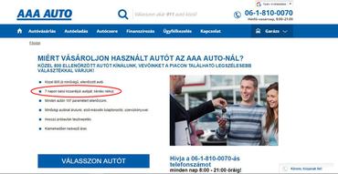 Mivel az Autocentrum AAA Auto honlapján a cikk írásakor is olvasható, hogy, idézem "7 napon belül kicseréljük autóját, kérdés nélkül." arra gyanakodtam, hogy a kereskedés a bírság befizetése után sem változtatott a kettős kommunikációs stratégián és ezt erősítette bennem az a tény is, hogy a "A Gépjármű Értékesítés Általános Szerződési Feltételei" című dokumentum hétnapos cserére vonatkozó részében is ugyanúgy a vásárláskori állapot megtartásához kötik a cserét. Vagyis továbbra sem veszik vissza az autót, ha azért viszi vissza a vásárló, mert elromlott. Ezeket a feltételeket egyébként nem ott közlik, ahol a 7 napos cseréről írnak, hanem egy másik menüpontban és a cserelehetőség közelében utalás sincs arra, hogy nem olyan egyszerű a dolog, mint első olvasatra tűnik.