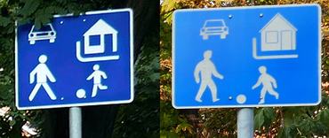 Sem színre, sem ábrázolásban nem egyeznek meg a közutakra kihelyezett táblák. Fotó: virci