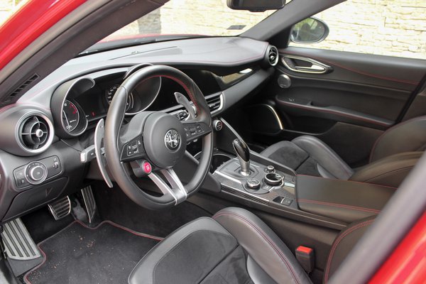 Ergonómiáját tekintve példás a tervezés, a beltérben használt anyagminőséget illetően sem okoz csalódást, viszont aggodalomra ad okot, hogy még a teszt elején minden gond nélkül megtankoltam, másnap valami miatt nem volt szomjas Giulia, csak csepegtetni lehetett bele a V-Powert. Ugyanígy a teszt elején az első üléseket kiszállásnál hátratolta, majd a gyújtás ráadásakor eredeti pozícióba vissza, addig másnap már nem minden alkalommal tértek vissza ülései az eredeti pozícióba. Ilyen volt az élet Júliával, egy top csajért áldozatokat kell hozni, és még az is lehet, hogy hisztisebb. Érdemes általánosságban is olyan helyen autót vásárolni, ahol az ügyfél hozzáértő támogatást kap a vásárlás után. Ez fokozottan igaz az Alfára.