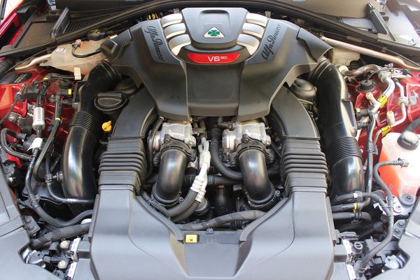 Nem csak Philippe az egyetlen, amit a Ferraritól hoztak: a QV motorja is Maranellóban készül, a Ferrari-gyárban. Az Alfa V6-osának furata és lökete pontosan megegyezik 488 GTB motorjáéval, gyakorlatilag a Ferrariban használt sokszoros díjnyertes motorból 2 henger levágásával készítették. Az 510 lóerős, 2,9 biturbós V6 a turbólyukat hírből sem ismeri. Olyan spontán a gázreakciója, mint egy szívónak, még a karakterisztikáját is igyekeztek az Alfa márkához hűvé alakítani: fordulatszám növelésre vadítóan erősödik.