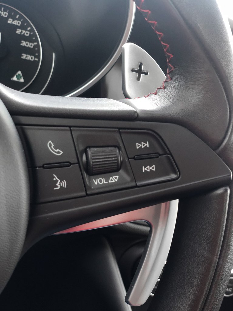 A gyors, ZF-től származó 8 sebességes automata váltó elöl, a hosszmotor mögött foglalja helyét a hajtásláncban. A gyakorlatban valóban hatásos a rendszer, Giulia gázadásra csökkenti alulkormányzottsági hajlamát. A ZF váltója a gyors váltást követően összezár, így ma már a múlté a régi bolygóműves váltóknál megszokott felbőgés, ami engem speciel kikergetne a világból. A váltást a kormány mögött, az autótörténelem valaha készült legszebb váltófüleivel intézhetjük.