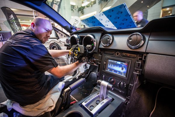 A belvárosi plázában kialakított arénában négy napon át tartott a munka. Ezalatt karosszériamódosításhoz a Rieger kínálatából választott komplett első lökhárítót, hátsó szoknyát és egy szárnyat szereltek fel, majd fóliába öltöztették az autót, egyedi Toyo kék-szürke dekort alkalmazva. Finom apróság, hogy a tükör burkolatában is ott a neves gumimárka neve, csak nem színnel, hanem aláfóliázással kialakított dombornyomással.