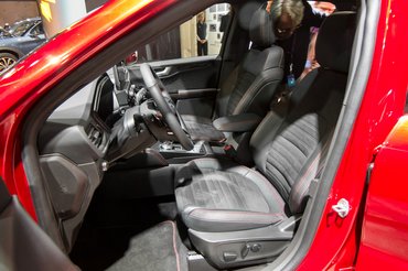 Itt ugye, a digiműszer eleve jó pont, az ajtókárpitok pedig szövetbetétesek, ráadásul kis, térbeli, kitapintható minták vannak benne – más fényben szerintem elég jól nézhet ki. Sajnos az amszterdami rendezvényesek valami gyilkos halogénfényekkel terítették be az autókat, amitől mindennek lett egy durván kékes árnyalata, ráadásul olyan erősek voltak a szpotok, hogy alattuk szerintem még a brikett is gyémántnak látszott volna. Mindenesetre itt is nagyjából olyan jó a puha-kemény műanyagok aránya, mint a Focusban, nagy baj nem lesz. Az ülés fasza, megvan a jó kis félretankolás-akadályozó betöltőnyílás – basszus, a rohanásban elfelejtettem csekkolni, hogy az aktív élvédők is ott vannak-e az ajtókon. Kicsit gyanús, hogy a becsukásakor nem hallottam a jellegzetes klattyanást. Ezt muszáj lesz ellenőriznem a valódi bemutatón.