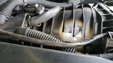 Később, a szervizben kiderült, hogy a motor majdnem kigyulladt. Erről tanúskodik a Mihály által küldött két fotó is, melyeken a műanyag szívócsövön keletkezett lyuk, illetve a motoron lévő burkolat zajcsillapító paplanján lévő olvadásnyom látható.