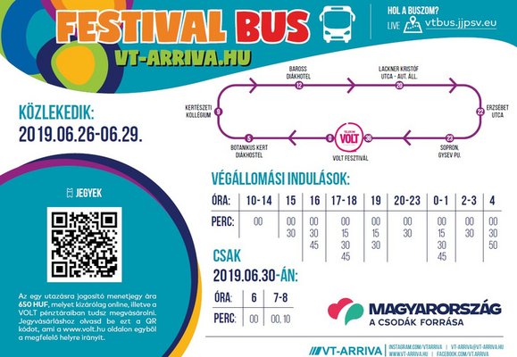 A VOLT Fesztivál együttműködő partnereként a VT-ARRIVA speciális fesztivál buszokat állít forgalomba, amelyek 2019. június 26–29. között Sopronban, a város pontjai és a rendezvény területe között menetrend szerint viszik a fesztiválozókat. A fesztivál busz szolgáltatás a repülőjegy beszállókártyájához hasonlóan, előre váltott QR kód jeggyel vehető igénybe, amelyet a VOLT fesztivál pénztáraiban, vagy a fesztivál honlapján ide kattintva lehet megvásárolni.