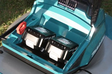 Mert igen, ebben is szabvány lítiumos Makita akksik vannak, amit átpattinthatunk bármelyik akksis Makita szerszámba. Már a vállalat is azt mondta, hogy nem akksis gépeket gyártanak, hanem gépeket a Makita akksikhoz. Ez egy tök jó hozzáállás, mert egészen nagy szerszámos bőröndöket vehetünk tőlük, amikben ugyanezek az akkumulátorok vannak, és ugyanazzal a töltővel mennek. Már a DLM460PG2 fűnyíró miatt is jó lehet beszerezni két ilyen akkumulátort pluszba, mert egy töltéssel a gép cirka 50 percet megy, viszont egy óra alatt tölt fel. Ha van kétszer két akksink, elég a tízperces sörpattintós-szünetet megtartani, nyírhatunk amíg tart a fű.