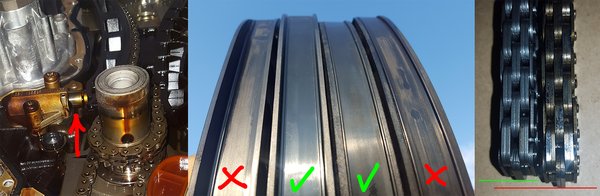 A vezérműlánc műanyag feszítőin közepes mértékű kopás látszódott, az elmúlt hat év alatt a műanyag morzsalék az olajcserék alkalmával fokozatosan a szervizekben maradt. Minimális felületi használat látszott a lánckerekeken is - betyáros magyar virtussal akár futhattak volna még tovább - de a szett részeként természetesen az újak kerültek felszerelésre, itt nem érdemes vacakolni. Bevallom azonban, hogy a hat számjegyű összeget jelentő okoskereket - a változó szívóoldali vezérlés beavatkozó elemét, lánckerekét - nem vásároltam meg, ezzel vállalva a kockázatot, ha mégis baja lesz a láncnak idővel, de nem lesz. Az okoskerék fogain alig volt felfedezhető a lánc futásának helye. Ezt a komponenst az ügyfeleknek is meg szoktuk spórolni, ide lőjenek! A rendszer fő rákfenéje maga a lánc és a feszítő.