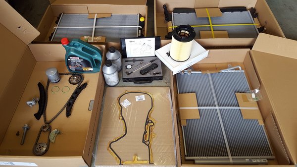 A gyári alkatrészek ára ugyan magasabb az utángyártott cuccoknál, de mégis megéri inkább az eredetit megvenni: így az időközben esetleg megvalósult alkatrész-evolúció (cikkszám-változás) esélyt ad arra, hogy a gyári adatgyűjtés alapján "megmérnökölt", tartósabb megoldást építsünk a gépbe. Sajnos esetemben a vezérlés szuvas foga, a tunya láncfeszítő egysége nem változott meg az eltelt idő alatt (ellentétben a 2.0 TSI-ével), így a motorolaj nyomásán kívül csak egy csenevész rugócska tartja a láncot valamelyest feszítve. Ebből származik a jellegzetes, láncait csörgető szellem-hang indítás után, amíg a motorolaj meg nem löki a kis dugattyút, és a lánc meg nem feszül.
