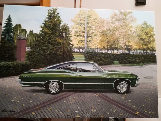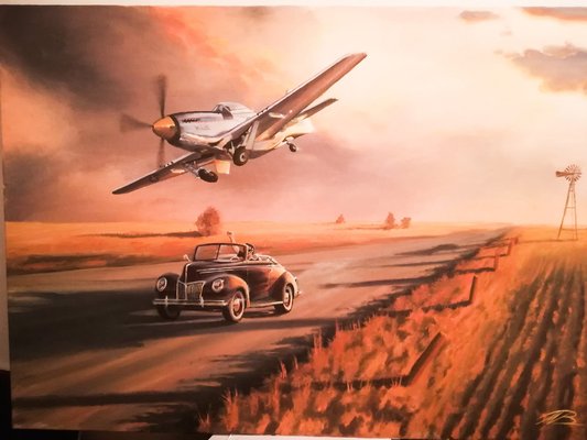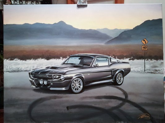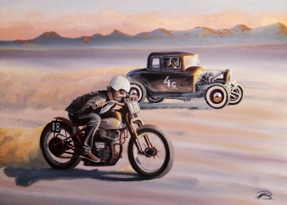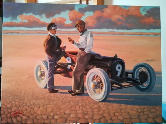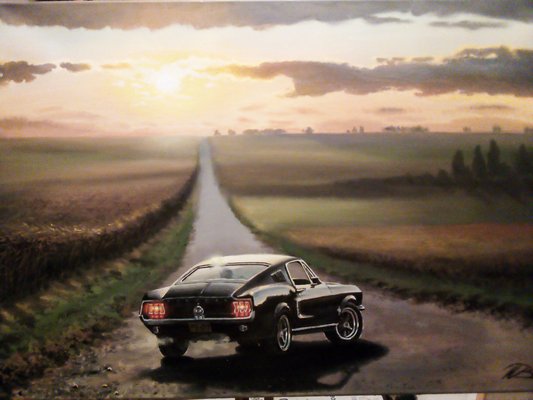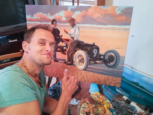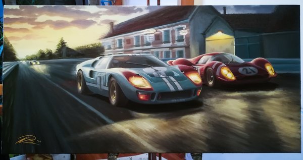 Szerencsére autós körből jövő ismerősök is elkezdtek megkeresni, hogy fessem le a kocsijukat, s az mindig felüdülés volt. Mellékvágányon, egy befejezett portré és az ötvenedik újabb tájkép között elkezdtem a saját ötleteimet is megvalósítani. Amikor megfestem, ahogy a Ford GT40 az Hunaudiéres-ben előzi a Ferrari P3-ast, vagy amikor nekiállok a kedvenc képemnek, a 66-os úton, naplementében álló Shelby Mustangnak, olyankor el se lehet rángatni a vászontól, mert teljesen beleélem magam a helyzetbe. Benne vagyok olyankor a képben.