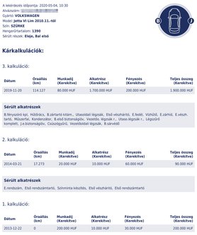 Felhívtam az autót hirdető HP Autó Kft. autókereskedését, ahol ezúttal bemutatkoztam, elmondtam, hogy mire gyanakszom és kértem, hogy nézzék meg a régi cikkemet. Közben más is történt. Mivel a hirdetésükben szerepel a Jetta alvázszáma, lekérdeztem a kártörténetét a Totálkár rendszeréből, így kiderült, hogy tavaly 1,9 millió forint értékű javítási kalkuláció készült hozzá egy sérülés miatt. Hihetetlenül furcsa volt, mivel szinte pontosan ugyanazokat az alkatrészeket sorolták fel az összefoglalóban, amelyek megsemmisültek a monori baleset során. Csak szinte, de erről később.