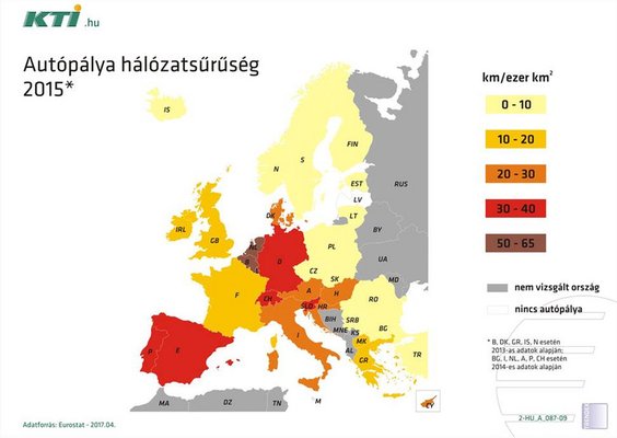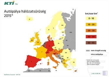 A magyar kormány gyakran hangoztatott célja, hogy 2030-ra az ország bármely pontjáról fél órán belül elérhető legyen egy gyorsforgalmi út. EU-s viszonylatban már 2015-ben sem álltunk rosszul, hiszen a KTI 2015-ös térképe szerint 20-30 km-nyi autópálya jut 1000 négyzetkilométerre, ezzel a régióban a legjobbak között vagyunk (csak Szlovénia előz meg minket), és európai átlagban is az erős középmezőnyben járunk.
