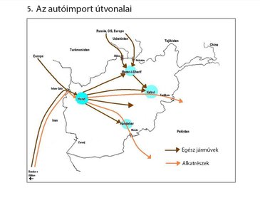 Az országba több irányból áramlott az import-autó: Hamburgból főleg (lopott, néhány éves) német és (balkormányos) japán autók érkeztek szárazföldi útvonalakon, Islam Qala határvárosában napi 80-100 darab áramlott a vámon át a nagyobb városok felé, ahol kandahári alkuszok passzolták őket tovább. Külföldiek, parancsnokok, kormánytisztviselők és civil szervezetek voltak a fő vásárlók, akik akár 50 ezer dollárt is megadtak egy-egy Land Cruiserért. Persze az interjúalanyok sem voltak vakok, ha valaki 300-400 Land Cruisert és 100 konténerre való alkatrészt importált, ott gyaníthatóan nem teljesen legális ügylet folyt, ám ezek jelentős része mögött inkább illegális forrásból származó pénzek tisztára mosása állt.