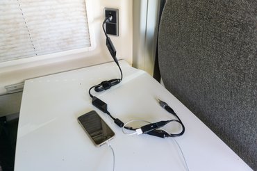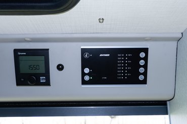 Az autó vízrendszere amúgy 100 liter tiszta vizet tud befogadni, ami fürdés és mosogatás után az ugyanekkora szürkevíztartályba folyik. A melegvízről a megszokott Truma 11 literes, 4 kW-os kombikazánja gondoskodik, tapasztalatom szerint igen gyorsan felmelegíti. A fürdő itt nem a korábbi Hymer Grand Canyonokban megszokott, felhajtható mosdós volt, hanem egy kis fix kiépítésű megoldás, a kényelem miatt elfordítható wc-vel. A zuhany hasonló, így az ablakon kinyúlva például a tengerparton külső zuhanyként is lehet használni a mellékelt tapadókorongos tartóval.