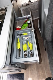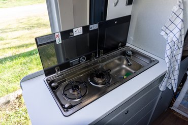 A Free 600-ban az egyre elterjedtebb, 12 voltról működő kompreszoros, 90 literes hűtő van, mélyhűtő résszel. Az 540-es modellnél a hűtő csak 70 literes, és a tűzhely alá került, az ajtóba. Nézőpont kérdése, de az nekem jobb megoldásnak tűnik, pláne nyáron, amikor így nem kell a hideg italért bemenni a kocsiba. Bónusznak van egy kis pakolórész a hűtő helyén, ami egy ilyen centire kiszámított beltérben igen jól tud jönni. Én az ivóvizes kannát szoktam oda tenni, ha olyan modell volt nálam, de például van egy finn pár, akik ilyesmi stílusú lakóban élnek évek óta, nekik egy kis fatüzeléses kályha van ott.