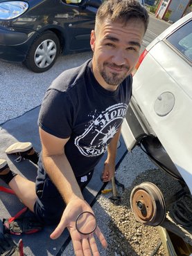 A másik szerencsém az volt, hogy a benzinkút melletti szerviz vezetője szokatlanul korán jött be, és ő sem tudta megállni, hogy ne feküdjön az Astra alá. A műhelyt feltúrtuk, amennyire lehet, és egy dízel BMW olajszűrőtömítése tűnt a legalkalmasabbnak, hogy legalább valamennyire gátolja a folyást. Ezúton is hatalmas köszönet a segítségért. Mire idáig eljutottunk, már eltűnt annyi benzin, hogy lement a nyílás szintje alá, tehát legalább ez könnyítette a szerelést.