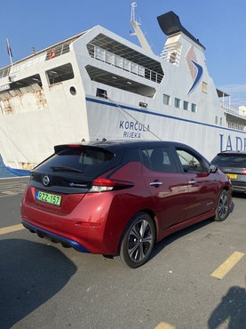 Ami fájt, az az ébredés volt reggel háromkor, főleg, hogy feleslegesen tettük. Splitbe délután három után kicsivel érkeztünk meg, a komphoz ötre kellett kiérni, hiszen fél hatra tervezték a kihajózást, de nem akartam kockáztatni, mert elképzelésem sem volt, mire számíthatunk a töltőpontokon. Hát, kényelmesen ideértünk volna egy 5-ös indulással is, az átlagsebességünk kaputól kapuig 80 km/óra körül alakult. A hajnal hármas indulás másik hátránya, hogy Gerivel most több koffeint veszünk magunkhoz, mint a Leaf áramot.