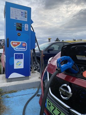 Úgy, hogy eleve nem nulláról kezdtük tölteni (140 km maradt benne), ez már elég volt a következő oszlopig, a 260 kilométerre fekvő Jasenicénél. Aki sokat jár erre nyaralni, az valószínűleg elment emellett a városka mellett: az autópálya a hegyoldalból hatalmas szinttel ereszkedik, és innen látszik először a tenger. Maga a benzinkút, ahol a töltőoszlop áll, nem egy festői hely, egy zsúfolt, árnyék nélküli autópálya pihenő, de csak az számított, hogy pont jól beértünk.