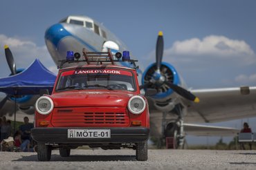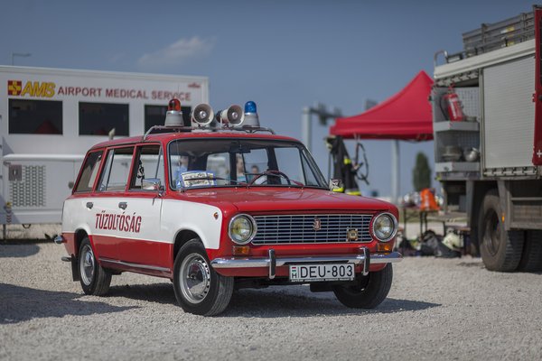 Na de kezdjük az elején, már ha ennek a napnak és rendezvénynek egyáltalán van eleje és vége, mert annyi mindent láttunk, hogy egyszerűen nem tudom, mit kellene leírni. Essünk túl az úgymond szolgálati közleményeken. Azt, hogy tűzoltó gépjárműfecskendő helyett tűzoltóautót írok, senki ne vegye tiszteletlenségnek, pusztán a könnyebb olvashatóság érdekében használom a köznyelvi elnevezést. Nyilvánvalóan jelen voltak az Aeropark állandó kiállításának darabjai is, a sokak által már ismert Wartburg 353W, a Lada 2102 kombi, a ”Follow me” Polo, a Volvo 245 Transfer és ebbe a díszes társaságba megérkezett a Saab 95 mérőautó is. Ők most a cikk hátsó etapjába szorulnak – Simbát és Faunt, a tűzoltóautókat kivéve, mivel ők kéklámpások –, de ha másért nem, Rézmonyó fotói miatt mindenképpen érdemes addig kitartani.
