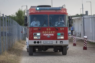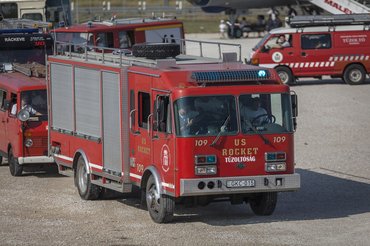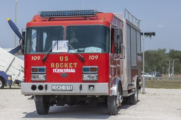 Az első gép, amire gyakorlatilag már akkor felkaptuk a fejünket, amikor még be sem léptünk a találkozóra, az a Martonvásári Önkéntes Tűzoltó Egyesület (Marton ÖTE) amerikai tűzoltóautója volt. A US Rocket nemcsak a találkozón volt egyedülálló, de Magyarországon is csak ez az egyetlen darab van belőle annak ellenére, hogy a Marton ÖTE tagjainak elmondása alapján ezzel a típussal szeretett volna az amerikai gyártó betörni a tűzoltóautók európai és konkrétan a magyar piacára. Az ERMI 23 típusú gépről az interneten gyakorlatilag semmilyen információt nem lehet találni, így a Marton ÖTE által összegyűjtött adatokra és a tagok által meséltekre kell hagyatkozni. A 8808 kg saját tömegű gép 15 000 kg-ig terhelhető, a 2300 literes víztartály mellett egy 230 literes habtartályt is cipel magával, egy 10 bar nyomáson 1890 liter/perces vízszivattyú mellett. Az akár 15 tonnás gépet egy 6,6 literes, 250 lóerős – részben nem polgári felhasználásra tervezett – turbodiesel Caterpillar motor mozgatja. A hajtása 4x2, vezető által kapcsolható 4x4-es differenciálzárral, amely a végsebességet jelentősen befolyásolja: míg 4x2 esetén 100 km/h, addig 4x4 esetén már csak 50 km/h. Mivel amerikai gépről van szó, kötelező információként a fogyasztásáról is szót kell ejteni, városi közlekedés esetén 33 l/100 km, közúton pedig 24 l/100 km. Nem éppen egy megdöbbentő adat, többre számítottam.