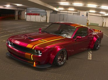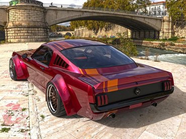 Valaki pedig virtuálisan szereti ezeket megvalósítani, így született ez a furcsa alkotás is: az alapja egy 1965-ös Ford Mustang, amire a Dodge Challenger Hellcat orra és motorházteteje került. Természetesen az autó többi része se maradt érintetlen: a modern felnikre húzott gigantikus szélesítések, illetve a decens ültetés szinte kötelező lépések voltak.