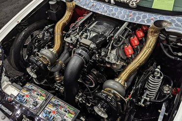 A Renegade Civic hosszú hónapokon keresztül készült, és közben eléggé megváltozott az autó jellege. Hogy mindjárt kezdjük is a legkomolyabb módosítással, a pörgős kis Honda-motort kihajították, a helyét egy 427 köbinches, tehát hétliteres LS V8-as vette át. Ez sem maradt tuning nélkül, és két turbófeltöltőt is ráakasztottak, na meg a nitró sem maradhatott ki a képletből. Majdnem kifelejtettem: ez a Honda hátul hajt.