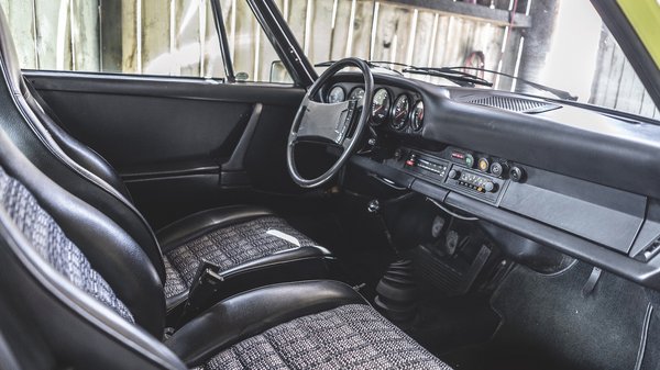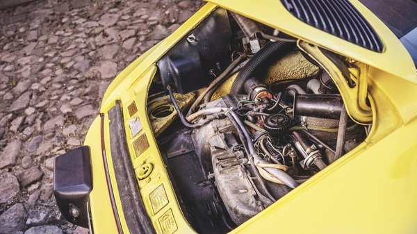 Világos sárga fényezése nagyon jól mutat egy 1974-es Porsche 911 S-en, melynek 175 lóerős, 2,7 literes, hathengeres bokszermotorja akár 225 km/órás sebességgel is repítheti az autót, de ez itt most nem az, hiába látszik a hat hengerre vonatkozó gyújtássorrend a motortér apró táblácskáján. Ez az autó Zuffenhausenből nem Emden kikötőjébe került, hogy onnan aztán New Yorkba utazzon, hanem az amerikai specifikációjú 911-est a gyártás során levették a futószalagról és motor, váltó, üzemanyagtank és szivattyú nélkül vitték a weissachi fejlesztőközpontba.