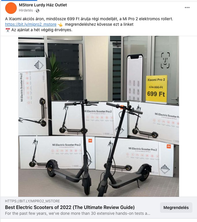 Ugyanúgy, ahogy az autóhirdetéseknél, úgy a különféle kütyük esetén sem lesz igaz, ami túl szépnek hangzik. Nincs ez másképp akkor sem, amikor a Facebookon járunk: egy ismeretlen csaló az itthon ismert, tisztességes forgalmazó nevével és szöveges tartalmaival visszaélve, gátlástalanul próbál kártyaadatokat szerezni, ígérve cserébe azt, hogy 699 forintért rollerhez juttatja a vevőket.