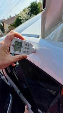 Már a szokásos körbejárásnál elkönyveltem, hogy valami volt az autóval, nem igazán futottak az illesztések, ráadásul több helyen is gyanús volt. Az elején volt egy pici fújás, ajtók rendben, sárvédők alja szintén. Viszont ahogy haladtam egyre feljebb, a tetőkeret és a C oszlop külső vonalán, igen vastag 700-1200 mikron körüli értékek kezdtek sorakozni. Ilyenkor azért az ajtókon, küszöbökön, sárvédőíveken hasonló értéket mérhetünk, de itt szinte semmi, csak egy színt kaptak. Gittelésnek nyomna sincs. Az autó középvonalától felfelé viszont egy korrekt hőszigetelést kapott az autó. A tető szintén fújva, gittelve, legalábbis az a minimális rész, ami nem üvegből készült.