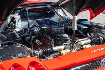 Piros színe és fekete bőrkárpitos beltere is szokványos elem ezeknél az autóknál, ennek az Enzónak a csomagtérfedele adja meg azt a pluszt, ami miatt kívánatosabb lehet a többinél. A karbon elemet ugyanis többek közt Michael Schumacher is aláírta.