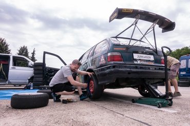 A pálya utolsó kanyarjában, ha az előző ívek jól adták ki, egészen harmadikig fel lehet húzni, márpedig az már erősen száz feletti tempó, ott alákuplungolni és megúsztatni olyan élmény, ami mérhetetlen tiszteletet ébreszt a ralipilóták iránt, akik mindezt erdőben, fák között csinálják. A drift, mint műfaj továbbra sem került hozzám közelebb, viszont mostanra értem, mi az, amit szeretnek benne: a driftelő autó nem csak szimplán gyors, de folyamatosan egy határhelyzetben van, ami rátesz egy szorzót a sebességélményre. Miután Gyuri cimborám három napig szívott az autóm futóművével, hálából elvittem magammal a rendezvényre, és külön hozzátesz az élményhez, amikor a valaki ül a jobb egyen, és üvölti, hogy sikerülni fog, vagy hogy elbasztad. Mindkettő egyformán motiváló. Ja, Gyuri körbetalált a pályán: