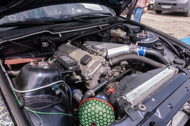 Itt sem estek túlzásba az építők: Zsolti egy olcsó, Maxpeedingrods turbó talpát vágta le, és hegesztette hozzá a BMW saját leömlőjéhez, persze a turbón magán is alakítottak. Az egész rendszert egy Maxxecu motorvezérlő dirigálja, és ahogy arra RMS Geri a Parkoló Parádés Mesterkurzusában kitért, ez teszi ki az autó értékének majdnem a felét. A motornak kis kíméletet jelent, hogy etanollal megy, így jól bírja a 300 lóerő körüli gyötrést, pedig van benne már vagy 800 driftkör, ami gyári belsőséggel nem rossz eredmény. Egyedül a szeleprugókat cserélték erősebbre, hogy az ALS (erről mindjárt lesz szó) gázlengéseinek ellen tartsanak.