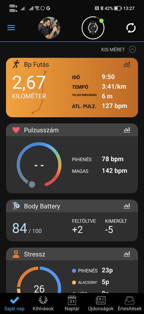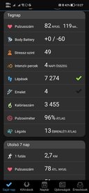 Ez a Solar modell, vagyis egy kis napelemes réteg veszi körbe a kijelzőt. Ebben nem volt sok bizodalmam, egészen addig, amíg a napsütötte rendezvényes napot követően, amit még az este kiírt 8 nappal indítottam, estére 9 napra nőtt, szóval csak van valami értelme. Ami megfogott benne, a hosszú működési időtartam, az érzésre eléggé agyonverhetetlen, hagyományos óraás kinézet és hogy nagyon kényelmes. A funkciók teljesen jól működnek, bár egy UX szakembert ezért elviselt volna az applikáció, pár dologhoz több taperolás kell a telefonon, mint indokolt. Most két napja a hosszabb rendezvények után jelentkező fantomkarszalag mintájára fantomkarórám lett, szóval a Garmin bekerült a lehetséges jelöltek közé (a másik az Apple Watch).