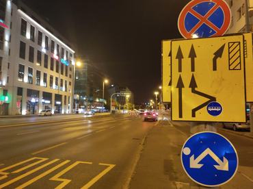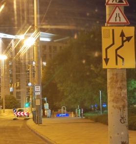 Itt is látható ez a kikerülési irányt jelző táblával ellátott akadály, amit a jobb oldali sáv kikerül, ezért egy kis időre összeszűkül egy sávra, majd ismét kettéválik egyenesen haladó és a Váci útra jobbra kanyarodó sávra. Ezt a sárga ideiglenes felfestések jól láthatóan lekövetik, még ha elsőre nem is valami kellemes, és a tábla nem lett volna baj, ha hamarabb kint van a Dózsa György úton. A másik forgalmi sávot pedig megkapja a szembejövő oldal, mivel a túloldalon is kellett a hely az építkezéshez.