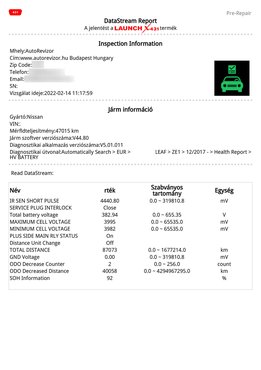 Megbeszéltük Istvánnal, hogy elkanyarodik felénk, és kiolvassuk a telepen álló, 2018-tól gyártott, második generációs Nissan Leafek komputerét. Az eredmény mindkettőnk számára sokkoló volt, hiszen a műszerfalon jelzett szám csupán töredékét mutatta a belső komputerben jelzett értékeknek mindkét autó esetében. Az egyik meghirdetett Leaf órája 38557 km-t jelzett, miközben a kiolvasás TOTAL DISTANCE (teljes távolság) névre keresztelt rubrikája 85951-et. Ha ez még nem lett volna elég, jöttek a további lesújtó sorok: ODO DECREASE COUNTER: 2 (csökkentések száma), ODO DECREASE DISTANCE (csökkentett távolság) 47394 km.