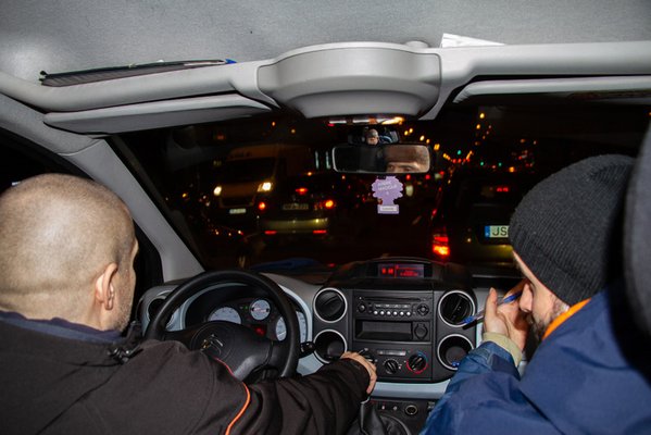 Csabi és Gábor úgy ismeri Budapest utcáit, ahogy kevesen. Minden sarokra van egy történetük. A Terézvárosban óriásinak ható Berlingo volánja mögött egymást váltva röpködtek a fiús témák – autók, csajok, meló, család, sör – , de közben úgy pásztázta a szemük a jellegzetes menedékeket és ismert helyeket, mint egy mesterlövész az ellenséges területet, hátha meglátnak egy fekvő vagy üldögélő embert. Ha kiszúrnak valakit, megállnak és megkérdezik: “hogy vagy?” - más úgysem teszi.