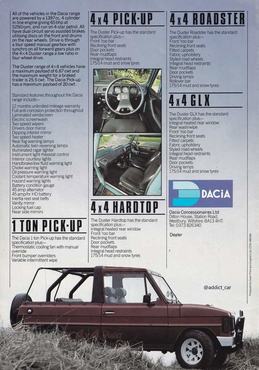 Miközben a 1310 egytonnás pickupként egy darabig még túlélte a briteknél, az összkerék-meghajtású Dustert meg lehetett venni keménytetővel és ponyvával is, 12 hónap általános és átrozsdásodás elleni garanciával is.