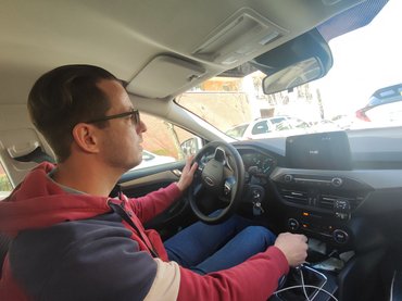 Bálint(39) több, mint húsz éve vezet, hármuk közül ő a legnagyobb autórajongó. A garázsában egy felújításra váró Pontiac Firebird pihen, így most sajnos nem azzal mentünk, hanem egy decens Ford Focus cégautóval.