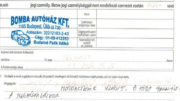 A vásárláskor olvasónk sejtette, hogy valami nincs rendben, ezért beleíratta az adásvételi szerződés megjegyzés rovatába, hogy a motorhiba lámpa világít, majd kifizette és birtokba vette az autót. Mint levelében is írja, a szándéka ezzel az volt, hogy bebiztosítsa magát – ez kapufa. Az adásvételi szerződésre egyébként az Amper Autóház helyett az idén alapított Bomba Autóház került eladóként, ami olvasónkban további rossz érzéseket keltett.