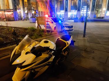 A fémdarab tehát maradt a zárban, mi pedig Balázs segítségével épp elkezdtük volna hazatolni a motort, amikor egy utolsó fotóra összeállás közepette felbukkant négy közteres. Elsőre megállt bennem az ütő: ezek azt hiszik, hogy most lopjuk a rendszám nélküli motort! - de hamar kiderült, hogy ők épp a bűnt üldözik közpénzen, és ezúttal az utcai sörfogyasztás nem maradhatott bírság nélkül.