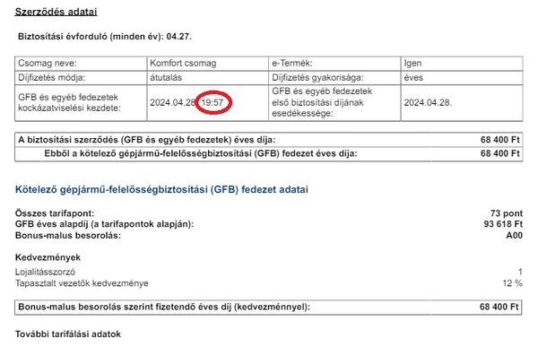 Nem lett. A kiérkező rendőrök hamar lelombozták, ez sajnos nem így működik. A KGFB törvény ugyanis megkülönbözteti a biztosítás kezdő napját a kockázatviselés kezdő időpontjától. Előbbit naptári napban méri, utóbbit órában-percben.