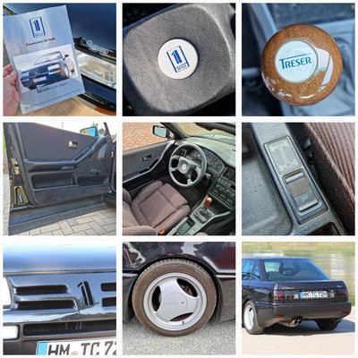 Más a hűtőrács, rajta a Treser-féle egyes. Fekete lett az index elől, hátul a teljes lámpatest. Az oldalsó és az első-hátsó légterelőket teljesen leengedték az aszfaltig, a kocsi sokkal alacsonyabb, de kedvezőbb lett a légellenállása. Walter azt mesélte erről a kocsiról, hogy a hátsó, csomagtér légterelő nélkül jobb a légellenállása, mint vele... A felnik Treser gyártmányok, ahogy a kormány s a váltógomb is. A technikához nem nyúltak, csak a külcsín módosult. Természetesen minden módosítás TÜV engedélyes, forgalmiba bejegyezve, elvégre egy autógyártó termékeiről beszélünk, még ha az inkább egy kicsi manufaktúra is, de IGAZI autógyártó. Autógyártó, megszállottaknak.