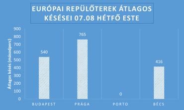 Ha a budapesti Liszt Ferenc Nemzetközi Repülőteret összehasonlítjuk az utasforgalom szerint hasonló prágai Vlaclav Havel, illetve portói Francisco de San Carneiro repülőtérrel, két nagyon különböző adatot kapunk. A vizsgált kora esti időszakban, azaz július 8-án 18:45 és 19:45 között a budapesti repülőtérre 12 járat érkezett, amelyek átlagosan 9 percet késtek. A prágai reptérre ezalatt 16 járat szállt le, átlagosan 12 perc és 45 másodperc késéssel, míg Portóban 7, amelyek mind pontosak voltak. Az budapesti repülőtérhez képest több mint kétszeres utasforgalmat bonyolító, de földrajzi szempontból releváns Bécsi Nemzetközi Repülőtér a vizsgált időszakban 31 járatot fogadott, amelyek átlagosan 6 percet és 56 másodpercet késtek.