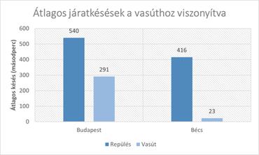 Ehhez az összehasonlításhoz fogjuk Budapest legforgalmasabb pályaudvarát, a Nyugatit, illetve a repülőteret, és vessük össze a vonatok pontosságát az azonos időszakban. 18:45 és 19:45 között 13 vonat érkezett a Nyugati Pályaudvarra, amelyek átlagosan 4 percet és 51 másodpercet késtek. Összehasonlításképp a bécsi főpályaudvarra érkező vonatok az azonos időszakban átlagosan 23 másodpercet késtek a reptér 6 perc 56 másodperces adataihoz képest. Az adatokat elnézve tehát kijelenthető, hogy a légiforgalomban, ahol a közlekedés három dimenzióban és szabadpályán lehetséges, sokkal nagyobb a késések valószínűsége, mint a kötöttpályát és gyakran elavult technológiákat használó vasúton.